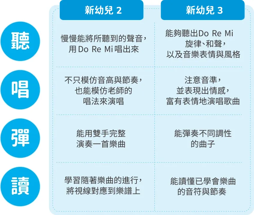 在這個階段,透過大量「聽音樂、唱歌曲、彈奏樂器」的體驗,